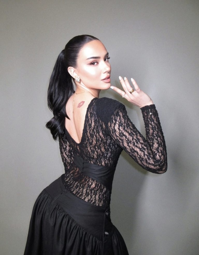 E veshur me fustan të gjatë e me shumë stil, Bora po shkëlqen në pamje.