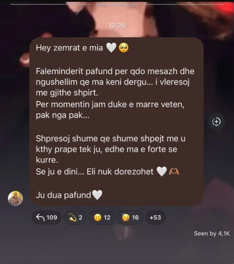 “Hey zemrat e mia! Faleminderit pafund për çdo mesazh dhe ngushëllim që ma keni dërgu… i vlerësoj me gjithë shpirt. Për momentin jam duke e marrë veten, pak nga pak…”, shkruan Elijona në mesazhin e saj.